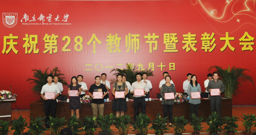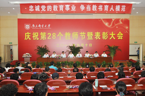 第28个教师节到来之际,我校2012年庆祝教师节暨表彰大会于9月10日下午在仙林校区图书馆报告厅隆重召开。校党委书记刘陈作重要讲话,校长杨震主持大会,校党委副书记朱永平,副校长朱洪波、王宗荣、蒋国平、颜晓红、张志华在主席台就座。