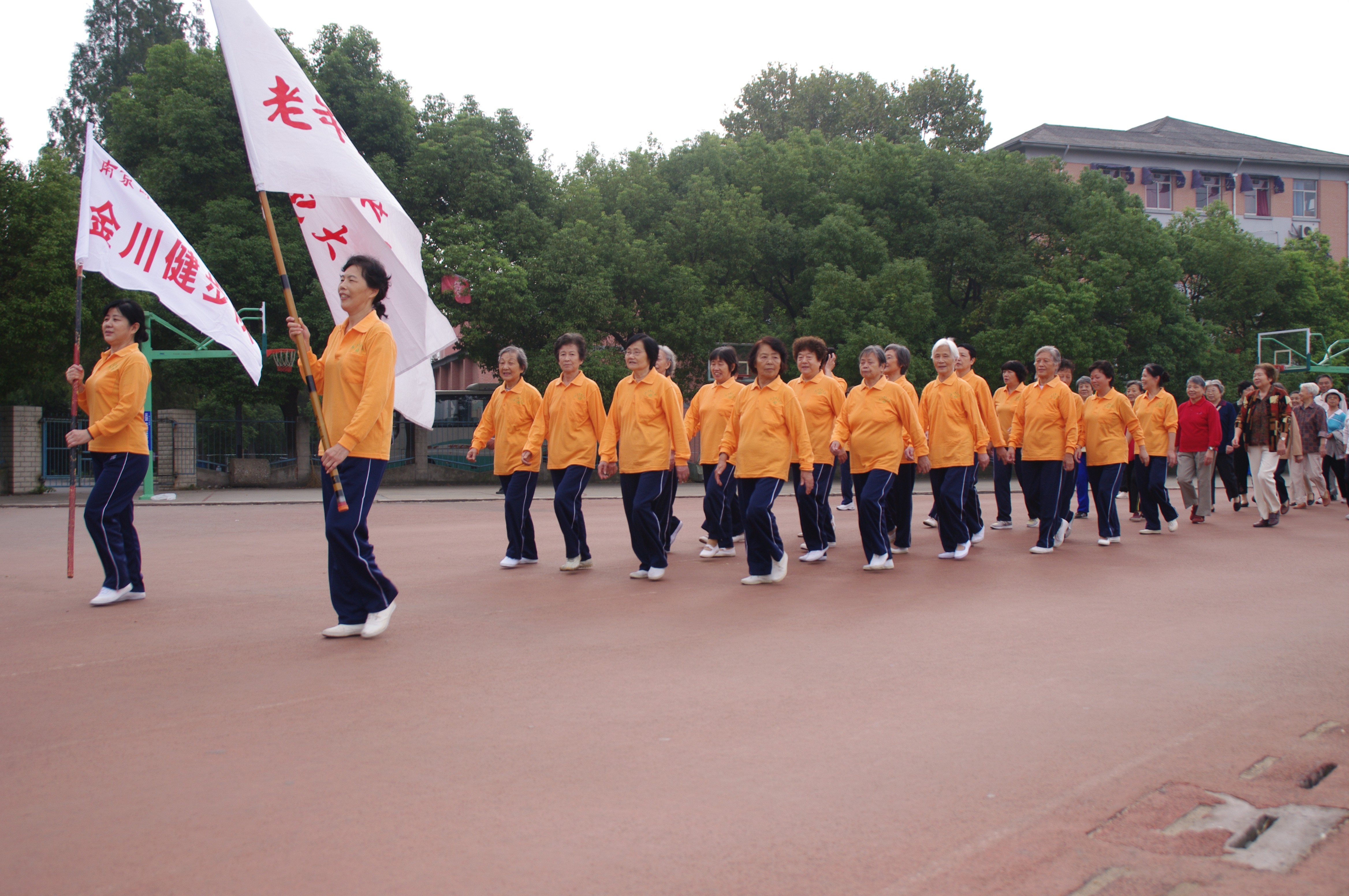 8时整,参加运动会的130多名离退休老教师、老同志聚集运动场,在老年体育协会会旗和金川健步队队旗指引下,迎着朝阳、迈着健步整队绕场一周,再现了老南邮人当年的矫健风采。