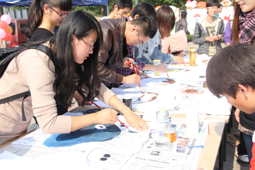 彩绘节现场布置了各学院同学精心设计的,以中国共产党和中华人民共和国为主题的彩绘T恤、扇子、手机壳、徽章,几十张方桌在广场上排成U字形,同学们争着挑选各种材料,自己动手为它着色。国旗、党徽、祖国大好河山、中国地图……一幅幅构思巧妙、构图精美,洋溢着青春气息的作品在同学们笔下熠熠生辉。大家争相向镜头展示自己的作品,对工作人员讲述作品的创作理念和灵感来源。许多教师也来到展台前纷纷书写对十八大的祝福:“祝祖国繁荣昌盛!”、“学习贯彻党的十八大精神,坚定不移地走中国特色社会主义道路!”大家用最质朴最直接的方式表达了对党的祝福,校园里弥漫着浓浓的爱国爱党氛围和情怀。