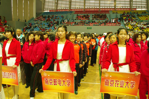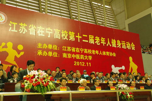 在举国欢庆党的十八大胜利召开之际,2012年11月10日上午,在宁高校第十二届老年人健身运动会在南京中医药大学仙林校区隆重举行。25所在宁高校的2500多名老年运动员聚会一堂,江苏省老年体协主席王湛、常务副主席华洪兴、南京中医药大学和各参赛院校领导、在宁高校和各参赛院校老年体协负责人出席了开幕式。我校党委副书记朱永平、离退休职工处处长李其芳和校老年体协主席桂立海到会,并亲临比赛现场和老同志们亲切交谈,给老同志们极大的鼓舞。开幕式上,由各参赛院校组队的女教师们为大会进行了精彩的健身球操表演。