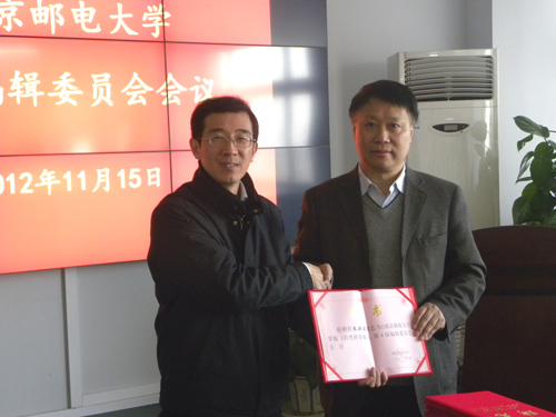 杨震校长宣读了中共南京邮电大学委员会党委发[2012]37号文件,宣布《南京邮电大学学报(自然科学版)》第八届编辑委员会、《南京邮电大学学报(社会科学版)》第五届编辑委员会成立。