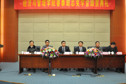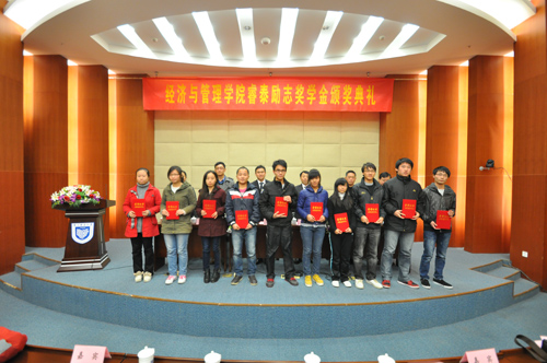 11月23日下午, 2011/2012学年睿泰励志奖学金颁奖典礼在仙林行政楼一楼报告厅隆重举行。副校长王宗荣,睿泰集团总裁艾顺刚、人力资源部经理夏秋石,校学生工作处处长许公全,经济与管理学院领导殷群、储成祥、彭刘生等出席典礼,各年级辅导员,全体获奖同学,各年级同学代表参加了典礼。