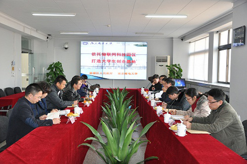 张登银主任对张国权处长一行的来访表示热烈欢迎,并围绕“依托物联网科技园区,打造大学生创业基地”主题,汇报了科技园的建设情况、学校对大学生创业基地建设的支持、基地建设的成效以及未来工作的重点方向。张主任强调,我校科技园在学校与鼓楼区政府的关心和支持下,在不长的时间里完成了大学生创业基地配套设施的建设工作,接下来科技园将进一步完善创新创业苗圃的实施方案,重点推进学生创新创业项目的孵化培育工作。