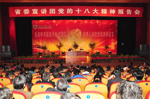 12月10日下午,“省委宣讲团十八大精神报告会”在我校仙林校区青春剧场举行。省委宣讲团成员、江苏省社会科学院副院长刘旺洪教授为我校师生作十八大精神辅导报告,我校校领导、中层干部、师生代表共600余人认真聆听了报告。校党委书记刘陈教授主持报告会。