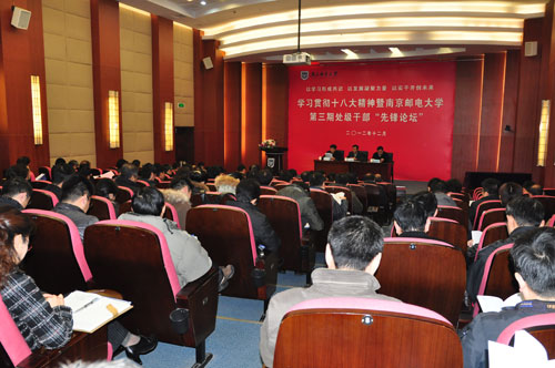 12月14日-15日,我校举办了旨在“以学习形成共识,以发展凝聚力量,以实干开创未来”的第三期处级干部“先锋论坛”。校党委书记刘陈、校长杨震作重要讲话,校党委副书记、纪委书记朱永平作党的十八大精神专题辅导报告,校党委常委、副校长朱洪波、王宗荣、蒋国平、张志华出席活动。学校处级干部参加了论坛。
