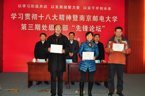 校长杨震作了重要讲话。杨校长充分肯定了本期“先锋论坛”所取得的成效,他结合自己对十八大精神的学习,阐述了对学校科学发展道路的理解,希望学校能早日达到五个方面的大目标:综合实力大幅度提升,成为真正的名校;教师有尊严、有成就感、有较好的待遇,爱岗敬业,教学科研成果不断涌现;学生爱校荣校,学校学风优良,学生中杰出人才辈出;学校管理井然有序、制度健全,做到依法治校、办事高效;校园环境优美,服务功能齐全。他希望大家共同努力,创造南邮明天的辉煌。