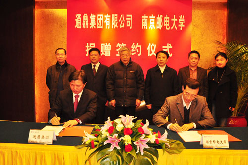 捐赠签约仪式于16日下午举行,通鼎集团有限公司董事长沈小平和我校校长杨震共同签署了捐赠协议。我校原党委书记谢玲,副校长王宗荣,以及通鼎集团有限公司销售部、办公室,我校党委办公室、校长办公室、学生处的相关负责人见证了签字仪式。