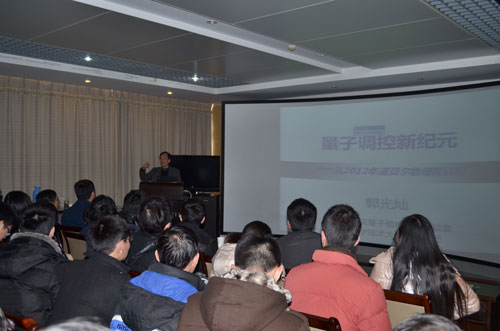 郭院士由2012年诺贝尔物理学奖授予量子物理学界两位专家的缘由谈起,回顾了在过去的几十年里量子物理理论、技术的发展与创新过程,预言未来100年内量子技术将把人类对未知物理世界的探索工作推向一个崭新的高度,同时也将会给人类的学习、工作、生活带来翻天覆地的变化,因而未来的世界将是量子调控技术掌控的奇妙新世界。报告会上郭院士以幽默的语言、深入浅出的说理,把复杂的量子世界栩栩如生地呈现在大家眼前,赢得了在场师生的阵阵掌声与会心笑声。报告会上,在场师生们反响热烈、踊跃提问,郭院士一一给予耐心回答、解释。
