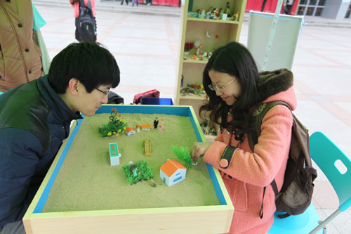 当天中午,心理健康教育周在主打活动——“遇见未知的自己”广场心理活动中拉开序幕,广场活动在南二广场举行,分为七个板块:心理知识竞赛、心理测试、心理咨询、沙盘体验、手语交流、心理漫画展、“正能量传递”活动宣传。寒风没有阻挡我校学生对自我的探索和心灵的关注,心理知识竞答区人头攒动,气氛热烈,同学们积极回答各类心理健康知识;心理测试区坐满了认真答题的同学,他们渴求通过测试深入了解自己;心理咨询区的同学向心理咨询师倾诉自己的心理困惑;沙盘体验区吸引了好奇的目光,同学们很想知道沙具的摆放如何揭示潜意识的活动;心理健康协会的同学在手语交流区展示着手语这种特别的沟通方式;心理漫画展通过诙谐、幽默的方式向同学们传达心理健康的理念;“正能量传递”活动宣传区的“正能量”玻璃球引起了同学们的注意,他们很想成为传递“正能量”的一员。