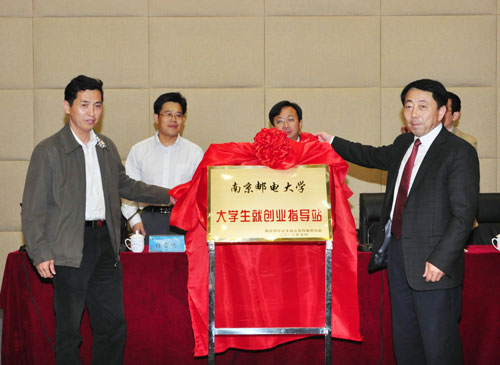 5月8日下午,我校就业创业工作推进大会在仙林校区行政楼一楼报告厅举行。江苏省高校招生就业指导服务中心主任任雷鸣,南京市人社局毕业生就业指导服务中心主任季顺祥,我校党委书记刘陈,校长杨震,副校长王宗荣、颜晓红出席会议,会议由颜晓红副校长主持。会议总结了我校2012年就业创业工作情况,进一步落实了我校就业创业工作的各项措施,并对2013年度就业创业工作提出了指导意见。季顺祥主任和王宗荣副校长为大学生就业创业指导站揭牌。