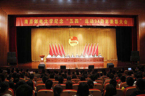 5月8日下午,南京邮电大学纪念“五•四”运动94周年暨表彰大会于仙林校区大学生活动中心青春剧场隆重举行。校党委常委、副校长王宗荣教授,党委办公室、校长办公室主任荆晅,组织部部长刘益华,宣传部部长徐雷,学生工作部部长许公全,研究生工作部部长胡玉东,保卫部部长毛建平,校工会主席彭洋,教务处副处长陈小惠,学生工作部副部长、校团委副书记饶林果共同出席大会并为获表彰代表颁奖。