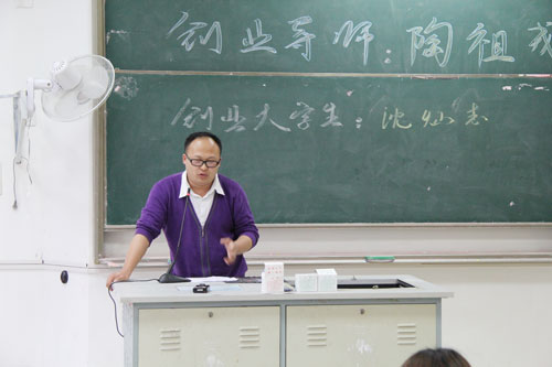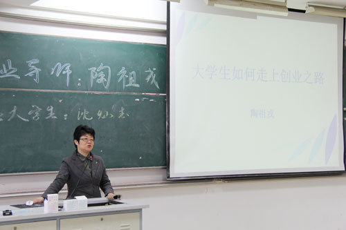 南京星海天创职业培训学校校长、中国促进就业委员会创业专业委员会委员、中国人社部SIYB创业培训执证教师陶祖戎女士就“大学生如何走上创业之路”作了专题讲座,旨在教育激励大学生养成放眼世界的眼光,激发大学生创新创业的激情与活力,培养大学生创业意识和创业精神。来自南京艺术学院的创业大学生代表沈灿志就创业过程与亲身体验跟大学生们进行了分享。