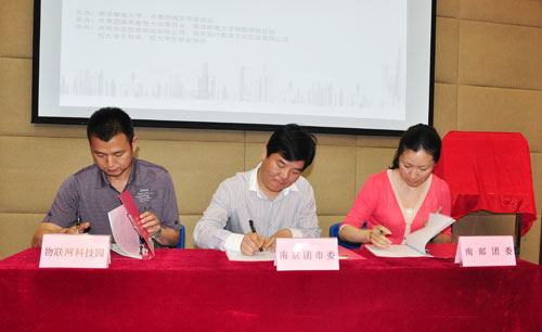 为了更好的服务青年大学生创新创业,共青团南京市委员会与我校整合双方资源,分别以南京团市委“青创梦想”创业孵化平台、南邮大学生创新创业竞赛平台、南邮“学生创新创业苗圃”为合作载体,携手实施合作,共同为南邮大学生创业建立一套完善的创新创业服务体系。共青团南京市委青工部部长蒋仲群、我校团委书记张敏、科技产业发展中心副主任杨小进共同签署了共建基地合作协议。