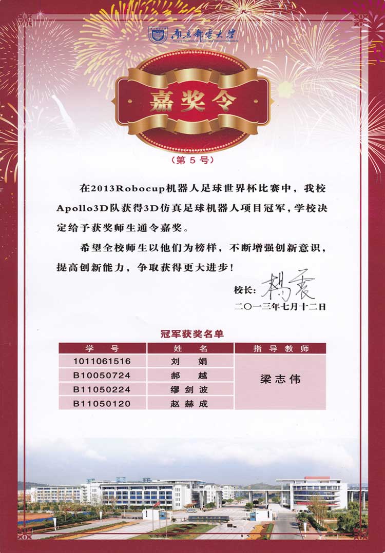 近日,我校学生在2013Robocup机器人足球世界杯比赛中获得3D仿真足球机器人项目冠军。 学校特发嘉奖令予以表彰,希望全校师生以他们为榜样,不断增强创新意识,提高创新能力,争取获得更大进步。