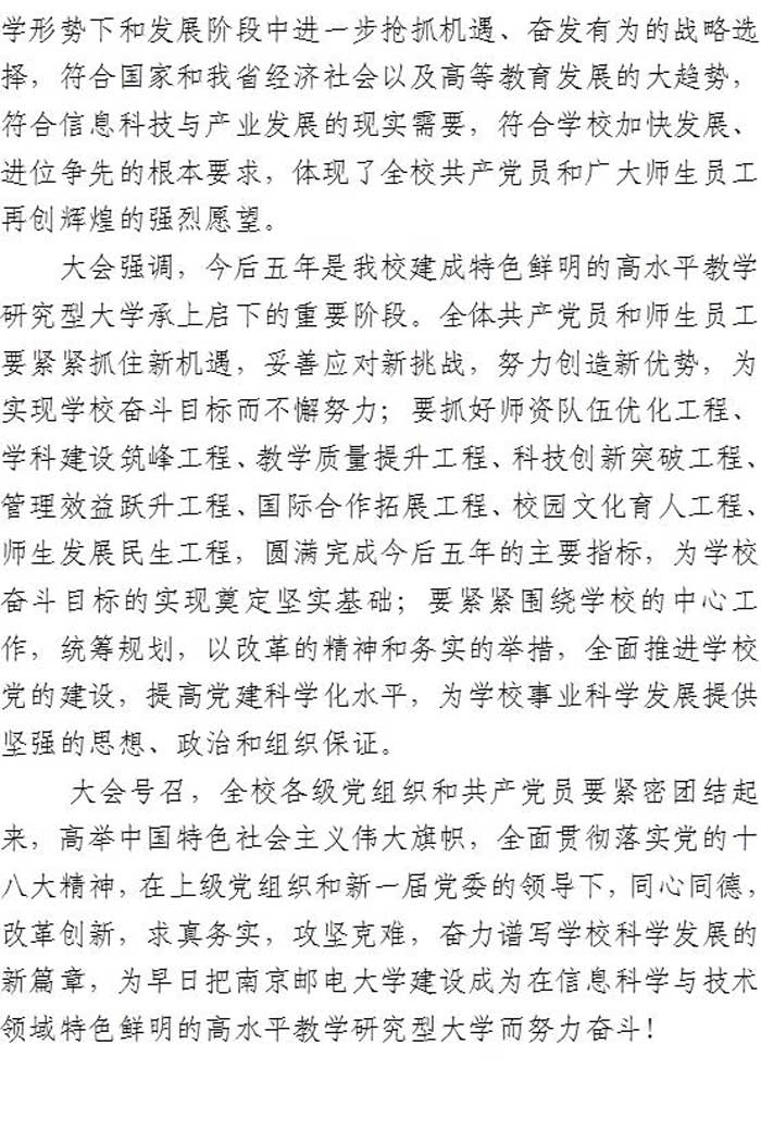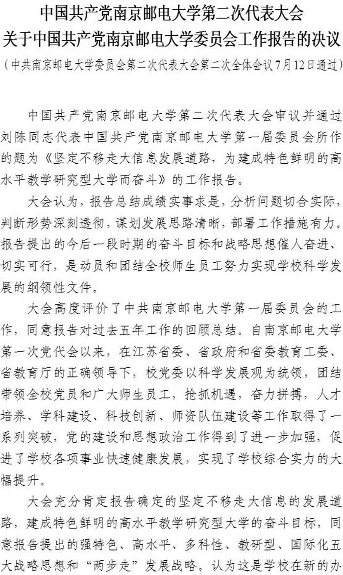 中国共产党南京邮电大学第二次代表大会关于中国共产党南京邮电大学委员会工作报告的决议