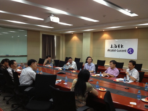 在上海贝尔股份有限公司,上海贝尔公司高级执行副总裁徐智群、我校校友上海贝尔公司副总裁殷月明等公司领导热情接待了朱副校长一行,双方互相介绍了各自的科研发展情况,探讨了可能的合作领域,随后副朱校长一行参观了该公司覆盖有线和无线方案、光接入方案、端到端LTE方案、光网络、IP网络、网络核心及应用、网络管理及服务等诸多领域的产品展示。