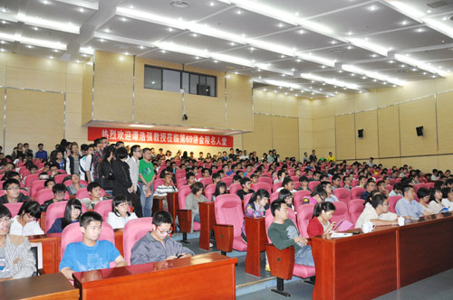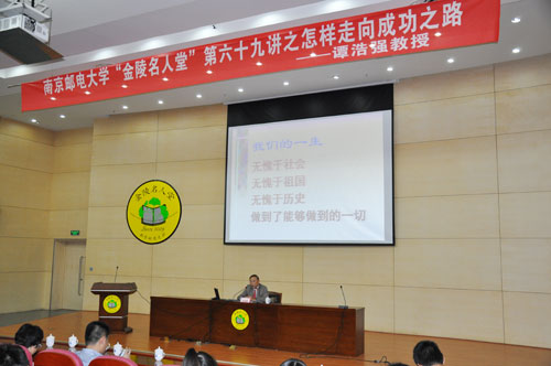 七十九岁高龄的谭教授精神矍铄,儒雅绅士,他在报告中深入阐述了只有坚定不移的贯彻理想,才有可能无愧于心的道理,为同学们讲解了取得成功路上必须处理好的个人发展与社会发展、机遇与努力、平凡与不平凡、政治与业务、理想与勤奋、学习与创新、专业与全面素质、顺利与挫折、个人成就与社会培养、年轻打好基础与一生健康发展等十大关系,勉励同学用信念支持精神,用毅力实现梦想,用知识改变命运,用坚强战胜困难,用宽容对待生活,用激情挑战人生,发现和把握一切机遇,在平凡的生活和工作岗位上努力追求做到最好,绽放青春光芒。