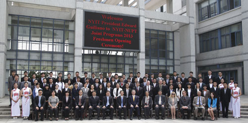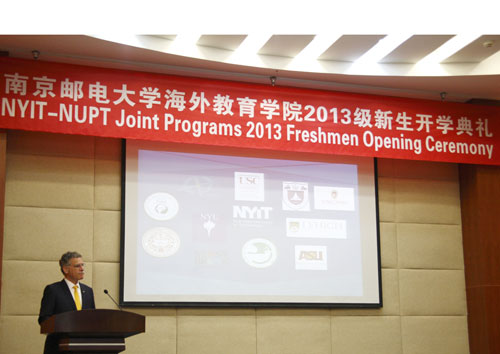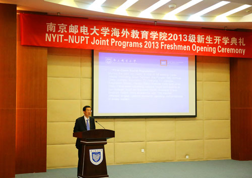10月9日上午,海外教育学院2013级新生开学典礼在行政楼报告厅隆重举行。出席典礼的领导和嘉宾有南京邮电大学校长杨震教授、纽约理工学院校长Edward Guiliano博士、南京邮电大学副校长蒋国平教授、江苏省教育厅国际合作与交流处副处长俞晓南、NYIT-NUPT美方院长Monique Taylor、美方副院长Keh Kwek、海外教育学院党委书记丁静、副院长胡碧媛、党委副书记钟凯等。参加本次开学典礼的还有海外教育学院中美方教师和2013级全体新生。典礼由海外教育学院院长宗平教授主持。