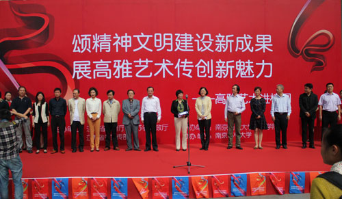 江苏省教育厅、南京师范大学领导,我校副校长叶美兰教授,学工处、校团委、教务处、传媒与艺术学院领导以及师生近200人参加了开幕式。开幕式上副校长叶美兰发表了热情洋溢的讲话,她指出绘画书法艺术是中国传统文化的重要组成部分,有着浓郁的东方情调和独特的韵味。它把造化与心灵相结合,变具象为抽象,化物态为情思,蕴含着无限丰富的表现力。书画不仅仅是美的享受,更对修养身心、培养创造性思维、提高人生境界有着重要作用。“高雅艺术进校园”活动是贯彻落实党的十七届六中全会提出的推进社会主义文化大发展大繁荣的战略目标和任务的有力举措,要进一步加强制度化、规范化建设,吸引更多的优秀艺术团体和社会力量参与该项活动,让更多的学校和师生受益。