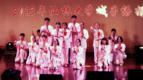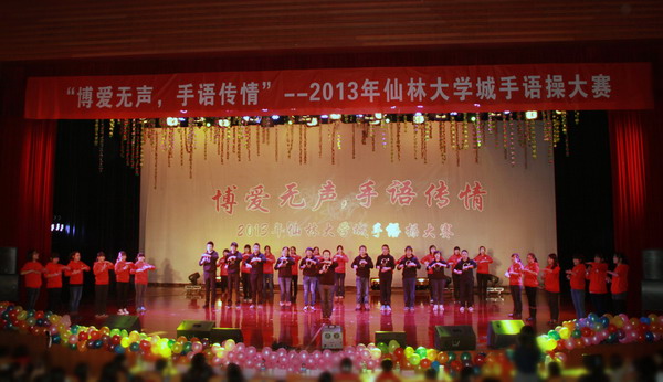 12月11日下午,“博爱无声,手语传情”仙林大学城2013年手语操大赛在我校举行。来自仙林大学城心理健康教育研究中心的16所高校师生齐聚我校青春剧场,一起用手语表达了“博爱无声”的主题。仙林大学城心理健康教育研究中心主任周红老师、我校学生处副处长徐欣老师分别为大赛致辞。16所高校心理健康教育中心的老师和心理健康协会学生600余人参加了本次比赛。