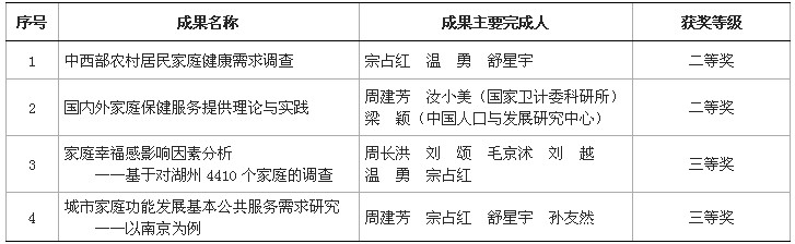 12月22—23日,“创新与改革——中国人口转变”学术研讨会暨中国人口学会2013年年会在北京召开,全国500多位专家学者参加会议,我校相关学科的6位教师与会作学术报告。 会上,中国人口学会和国家卫生计生委计划生育家庭发展司共同为全国“家庭发展理论与实践”研究获奖成果颁奖,共颁发一等奖10项、二等奖20项、三等奖30项。我校获二等奖、三等奖各2项。