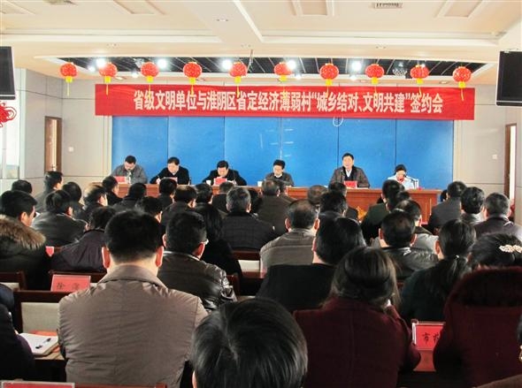 在签约会上49家省级文明单位与淮安市淮阴区13个省定经济薄弱村签订共建协议,计划通过结对双方共同努力,使结对村实现经济社会有新发展、环境面貌有新改善、文化生活有新充实、道德风尚有新提升。
