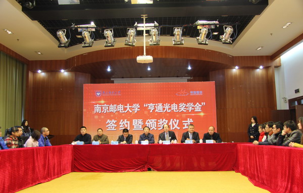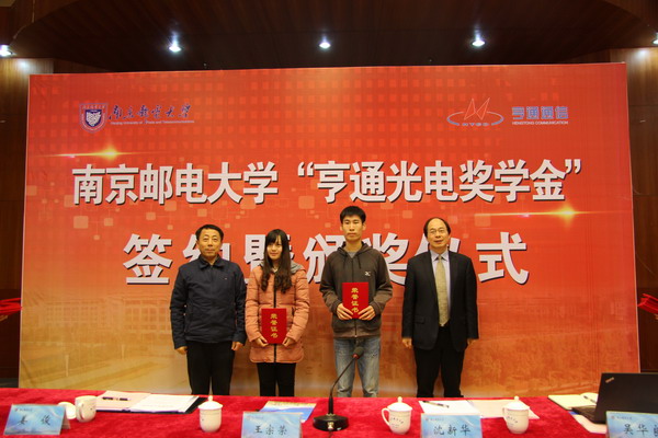 11月25日下午,南京邮电大学2014-2015学年“亨通光电奖学金”颁奖仪式在仙林校区大学生活动中心举行。亨通光电股份有限公司副总经理沈新华先生、我校副校长王宗荣为获奖学生颁奖。