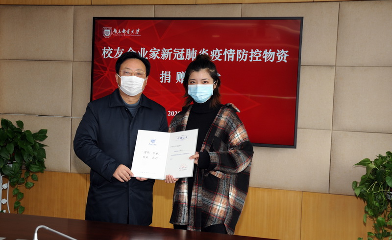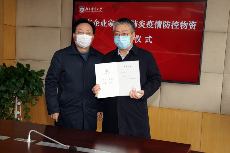 南京嘉环科技有限公司捐赠防护口罩两万只,南京数族信息科技有限公司捐赠防护口罩一万只、额温枪20支,江苏新纪元信息发展有限公司捐赠防护口罩五千只,另有B9827班校友委托徐剑校友捐赠防护口罩一千只。