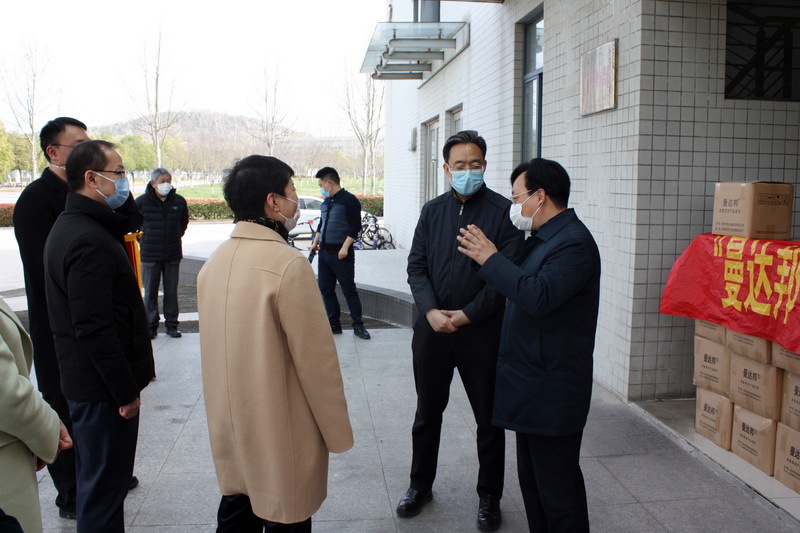 葛道凯厅长一行首先来到学校门诊部疫情防控物资储备库,查看了学校储备的口罩、温度计、测温枪、隔离衣、防护服等防疫用品。检查中,恰逢校友企业向学校捐赠防疫物资,葛厅长对我校积极发动校友参与学校疫情防控的做法给予了充分肯定。