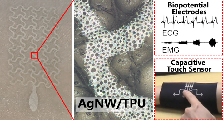 从左至右分别为:贴合在皮肤上的超薄透气性电极、光学显微镜下电极微观结构、作为生物电电极采集的心电图与肌电图信号与具有无线触摸传感功能的袖套