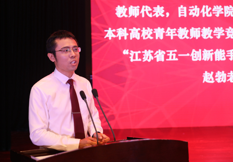 教师代表、自动化学院、人工智能学院赵勃老师发言,在第三届江苏省本科高校青年教师教学竞赛中,赵勃荣获工科组第一名并获特等奖。他分享了自己成长经历,儿时想成为一名教师的梦想成真,收获到了作为老师的幸福感,愿意为教书育人奉献年华。他感谢前辈们在教学上的帮助,希望同学们能以梦为马,不负韶华,让青春不留遗憾。