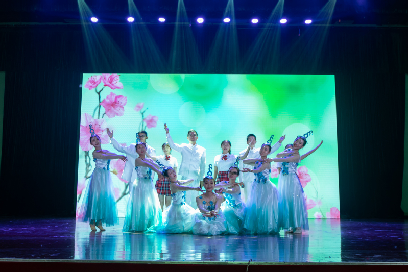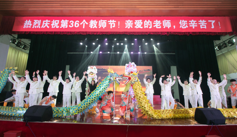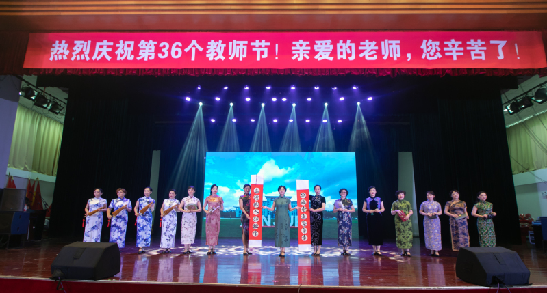 庆祝大会上学生表演了开场歌舞《亲爱的老师》,女教职工代表带来了旗袍秀表演,男博士带来了小合唱表演。
