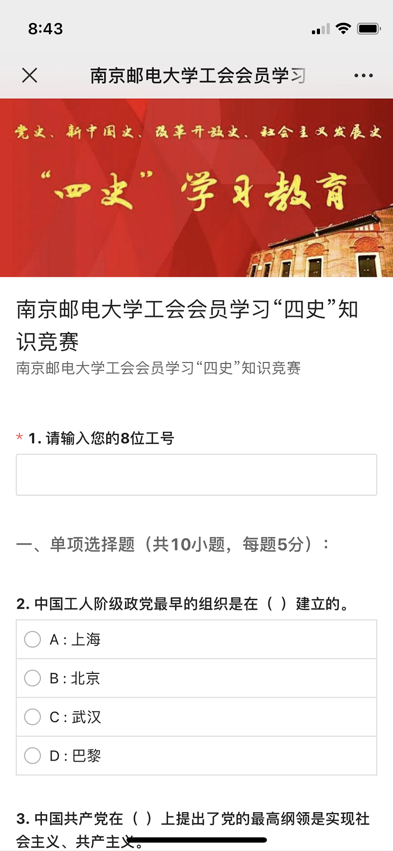 学校工会通过“乐动南邮”小程序在工会会员中开展学习“四史”知识竞赛活动,工会会员们踊跃参与,共有800余名教职工提交竞赛问卷。