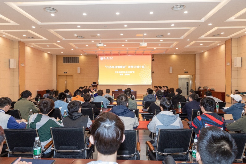江苏电信网络运行维护部孙普总经理介绍了“江苏电信雏鹰班”联合培养计划。江苏电信人力资源部嵇正鹏主任与我校王宗荣副书记共同签署了校企合作协议。