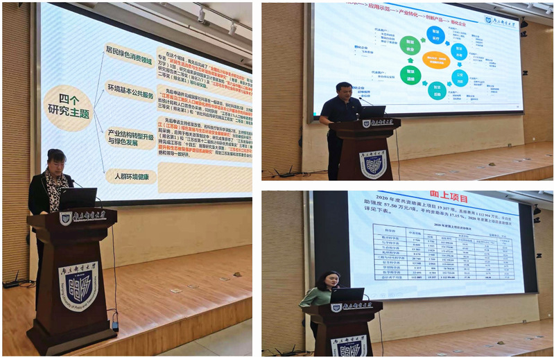 地理与生物信息学院杨莉教授讲述了她作为一名理学博士开展社会科学研究的工作历程,分享了她在交叉学科研究方面的一些经验和体会。边缘智能研究院院长郭永安副教授从六个思考问题出发,提出了开展产学研服务项目应深入了解行业形势需求、企业痛点难点,并强调做好每一个小项目、做有用的科研对项目壮大的重要性。材料科学与工程学院高丽教授列举具体实例,重点介绍了国家自然科学基金优秀青年基金项目申请中新形势政策、立意选题、研究内容等方面的心得和方法。