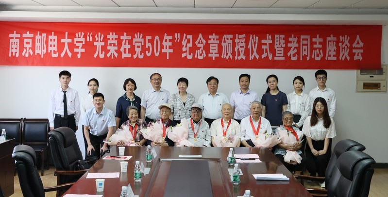 颁授仪式后举行了座谈会。原南京邮电学院党委书记兼院长谢玲饱含深情地回顾了入党初心和在党经历,他表示,荣获“光荣在党50年”纪念章,感到非常光荣和自豪,也非常激动,从懵懂少年,到学有所成、建设南邮、报效国家,都离不开党对自己的培养,他用“感恩在党50年”“有幸在党50年”“党永远在我心中”表达了自己对中国共产党的忠诚之心和感恩之情,并表示要继续为党的事业增光添彩。原南京邮电学院副院长、离休干部房庆新发言,他动情地回顾了自己的入党经历并表示,现在的幸福生活离不开革命先烈们的抛头颅、洒热血,在中国共产党的领导下,我们的国家取得了举世瞩目的成就,“没有共产党,就没有新中国”“中国共产党创造了人间奇迹”,作为一名老党员,要珍惜在党的每一天,不负组织期望,继续发挥好党员的先锋模范作用。老同志的深情讲述让与会师生深受感动。通信与信息工程学院学生党员代表丁奥发言,他讲到,老党员前辈们把毕生时光都奉献给了党的教育事业,为南邮培养出了一批又一批英才,前辈们的身上凝结着无数可贵品质和优良传统,值得新时代的南邮学子们不断学习、不断思考,激励青年学子以更高要求、更高标准努力学习,奋发前行。