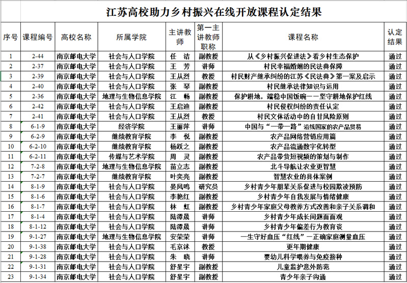 在省教育厅主办的江苏高校“助力乡村振兴 千门优课下乡”在线开放课程征集中,我校推荐申报的《农产品流通数字化转型》《乡村青少年朋辈关系促进与校园欺凌预防》等23门课程入选。