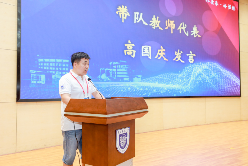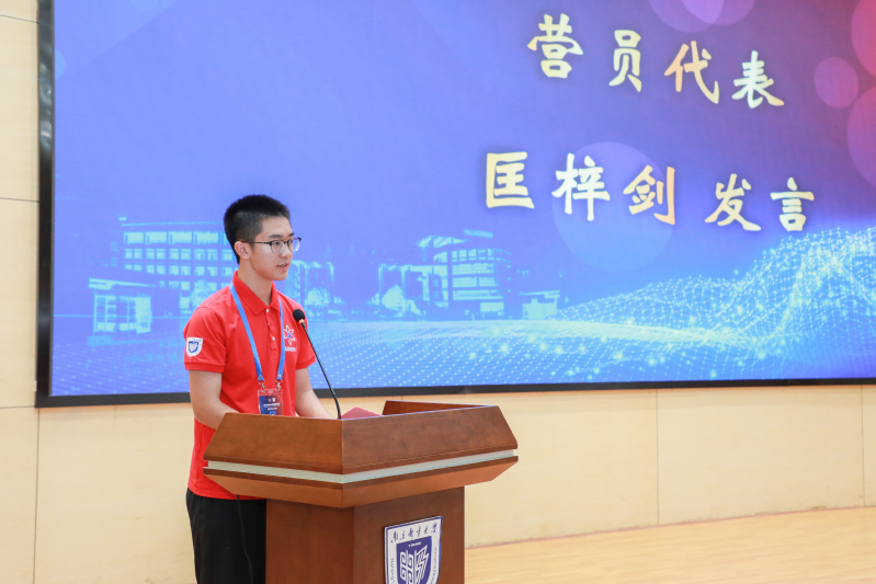 江苏省东台中学高国庆老师代表带队教师发言,表示将协助南邮做好营员管理服务工作,希望营员们在七天的科学之旅中学习科学思想,传递科学价值,为梦想插上科技的翅膀。江苏省大港中学匡梓剑同学表示,将把握科学实践机会,怀着对大学生活的憧憬,以一往无前和无所畏惧的精神勇登科学高峰。