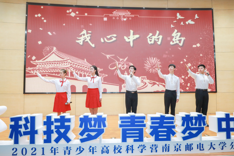 我校江苏省天翼大学生艺术团带来朗诵诗表演《我心中的岛》。节目以我校1958级校友徐六保的真实事迹为原型编创,他为国守岛21年的坚韧不拔之志与拳拳爱国之心激励着营员们踏实奉献,奋进报国。艺术团同学们精彩的表演赢得热烈掌声。