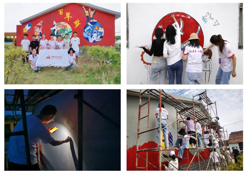 凝聚青春力量,描绘美丽乡村。为落实省委省政府关于建设美丽江苏的重大战略部署,传媒与艺术学院20余名学生到江苏南通开展“百年梦”墙绘创作。同学们发挥专业特长、执笔作画,为村镇单调的墙面换上了“新衣”,缤纷色彩增添活力;应用技术学院“柚子青年”实践团深入江苏宿迁,以建党百年为主题开展“手绘美丽乡村”墙绘创作,画出美好愿景,致敬百年征程,让文化墙成为沿途的“红色风景”。在实践过程中,师生感受到贡献青春力量、助力乡村建设的快乐,增强了服务社会的志愿精神,加深了广大青年与乡村的联系,为宣传红色文化、建设美丽江苏作出贡献。