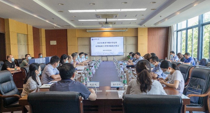 校党委常委、副校长郭宇锋向督查组详细介绍了我校疫情防控工作的组织管理、制度体系、监测预警、校园管控、后勤保障、核酸检测、物资储备、应急演练、开学方案等具体情况。