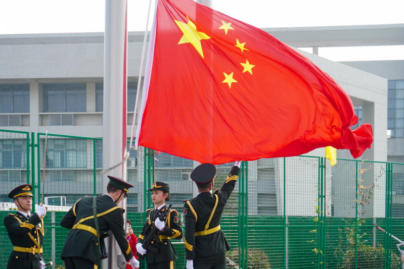 伴随着雄壮的国歌声,五星红旗冉冉升起,拉开了开学典礼的序幕。
