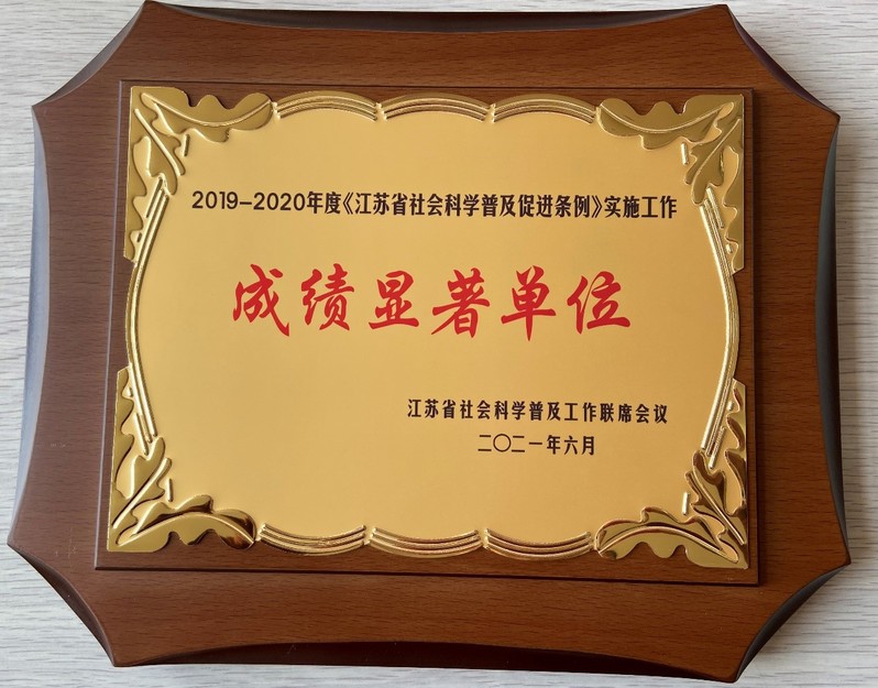 近日,省社会科学普及工作联席会议决定,对江苏省社会科学普及促进工作成绩显著的单位(部门)和个人予以通报表扬,并分别颁发奖牌和荣誉证书。我校社科联被授予“2019-2020年度《江苏省社会科学普及促进条例》实施工作成绩显著单位”。