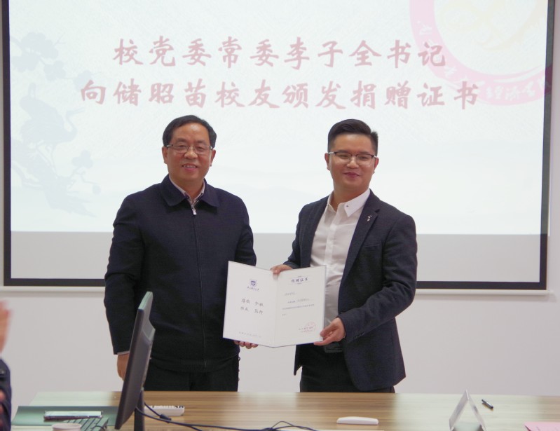 校党委常委、纪委书记李子全向储昭苗校友颁发捐赠证书