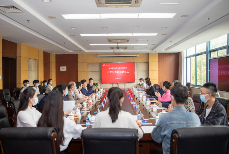 捐赠仪式上,叶美兰校长代表学校接受尹先为老师的捐赠,刘陈书记为尹先为老师颁发捐赠证书,学生代表向尹先为老师夫妇献花。