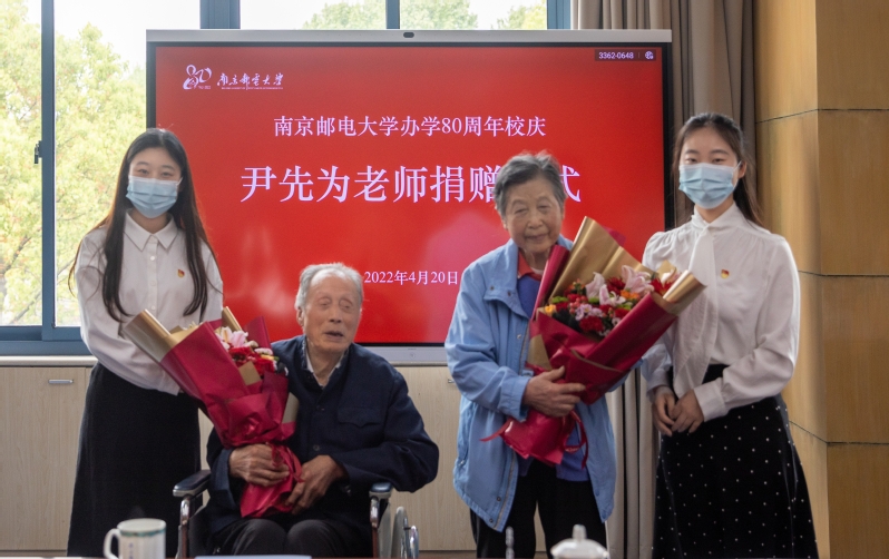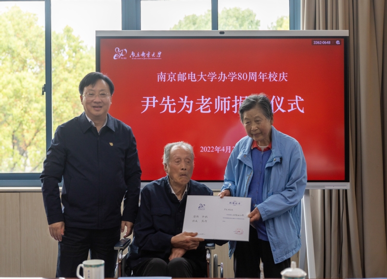 我校94岁高龄的离休教师尹先为一生节俭,却坚持要将省吃俭用攒下的毕生积蓄100万元全部捐赠给学校。4月20日,是南京邮电大学办学80周年的校庆日,一场特殊的捐赠仪式在仙林校区第一会议室举行。尹先为及其夫人白金汉,校党委书记刘陈,校长叶美兰,校党委常委、副校长、教育发展基金会理事长张志华,校党委常委、副校长王友国出席仪式。仪式由张志华副校长主持。