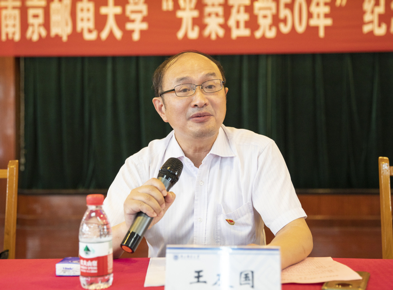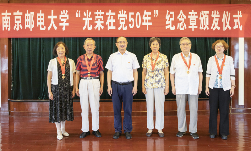 王友国副校长代表学校党委向10位纪念章获得者表示热烈祝贺和崇高敬意,为5位老党员代表颁发纪念章并合影留念。他号召全校师生饮水思源,感恩老党员的辛勤付出;薪火相传,赓续老党员的优良传统;接续奋斗,推动学校事业高质量发展,锚定立德树人根本任务、奋力书写南邮发展新篇章。