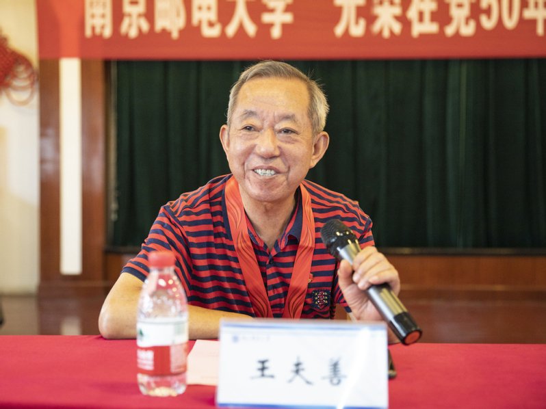 离退休党委第五支部书记、第一批“光荣在党50年”纪念章获得者孔宪禹老师代表离退休支部书记发言。他认为纪念章的颁发是对老党员的肯定、鼓励和鞭策,老党员要“人老心不老、人老心更红”,继续发光发热,为人民服务。通信与信息工程学院王宇、谢欣悦代表学生党员发言,感谢老党员对学校教育事业的无私奉献,表示要向老党员学习,继承老党员身上的优良品质,传承南邮红色血脉,努力学习,不负韶华、不负时代、不负人民。