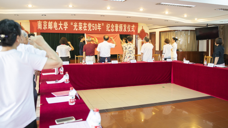 6月23日上午,我校在三牌楼校区举行“光荣在党50年”纪念章颁发仪式。校党委常委、副校长王友国,获得纪念章的老党员代表出席活动。组织部、宣传部和离退休工作处主要负责人,离退休党支部书记和部分学生代表参加仪式。