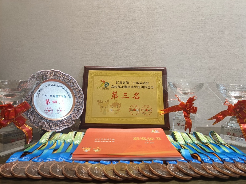 7月12日至15日,江苏省第二十届运动会高校部龙狮比赛在扬州举行。我校代表队出色发挥,在激烈角逐中,以总分46分夺得甲组第三名,这是我校在历届省运会龙狮比赛上取得的最好成绩。